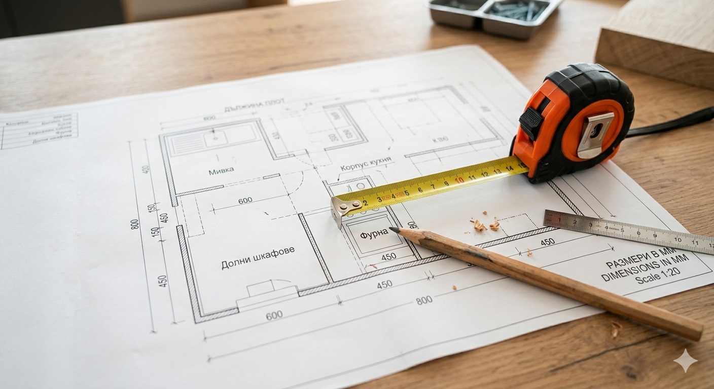 Грешките при монтажа на кухня почти никога не се случват по време на самия монтаж. Те се случват в подготовката — или по-точно, в липсата на такава. Повечето хора искат да стигнат бързо до „интересната част“ и прескачат стъпките, които изглеждат скучни: измерването, проверката на стените, скицирането на план. Резултатът се вижда по-късно — шкаф, който не влиза в предвидения ъгъл, плот, скъсен с два сантиметра повече, или ред врати, които не се затварят по една и съща линия.