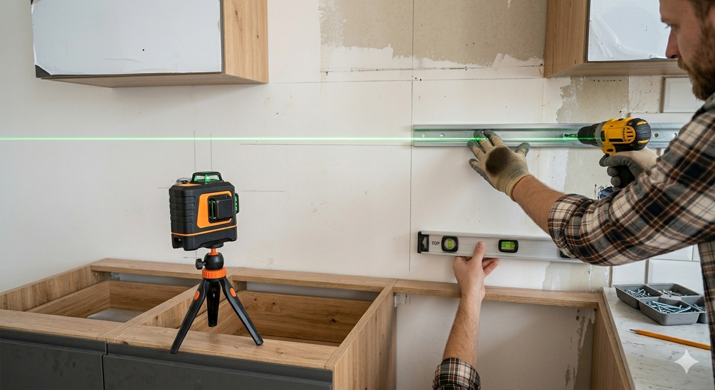 - Лазерен нивелир — критично важен за кухня. Обикновеното ниво не е достатъчно за дълги редове шкафове. Лазерният нивелир проектира перфектно хоризонтална линия на цялата стена за секунди.